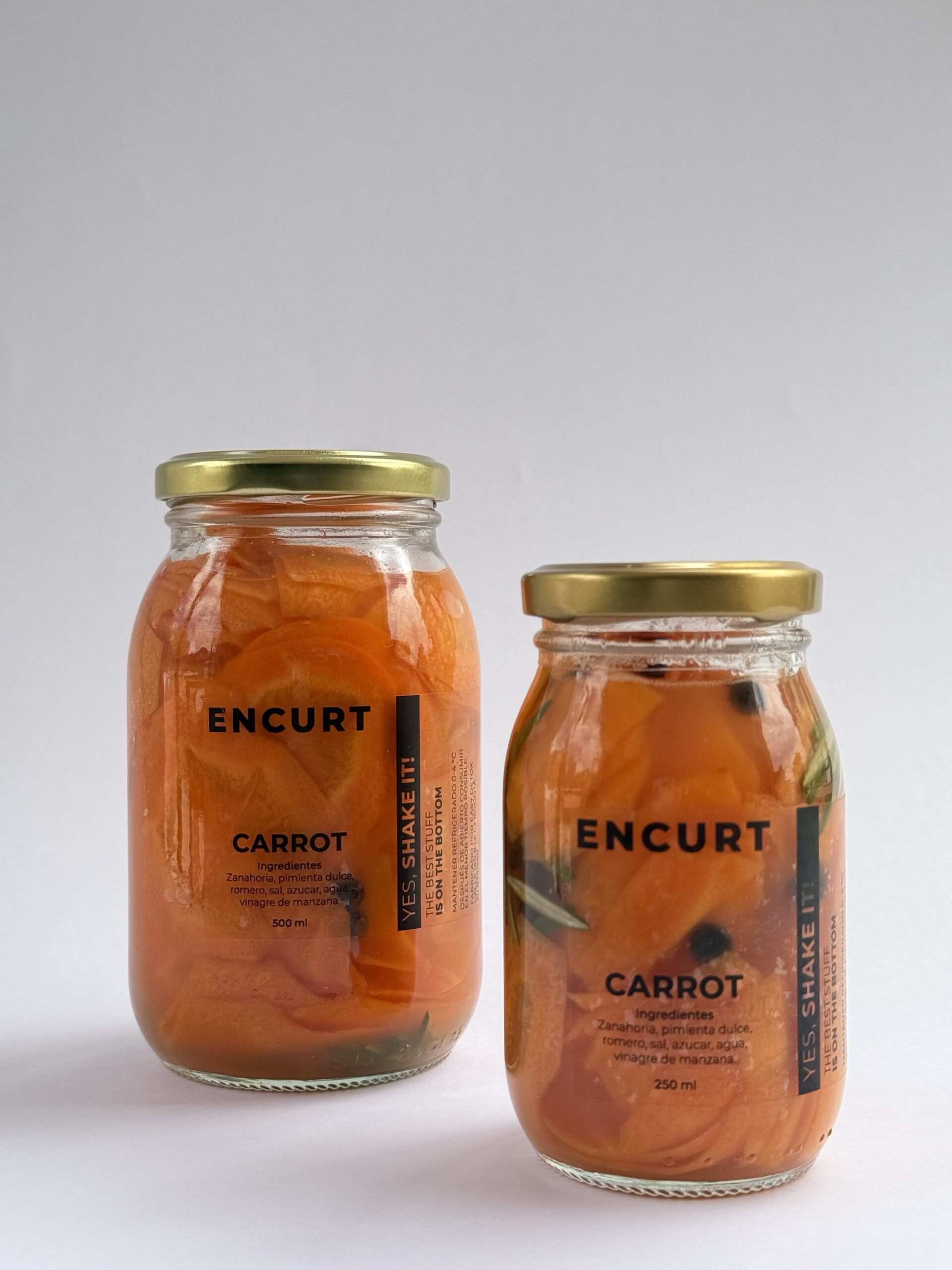 Encurtido de zanahoria, pimienta dulce, romero, sal, azúcar, agua y vinagre de manzana.