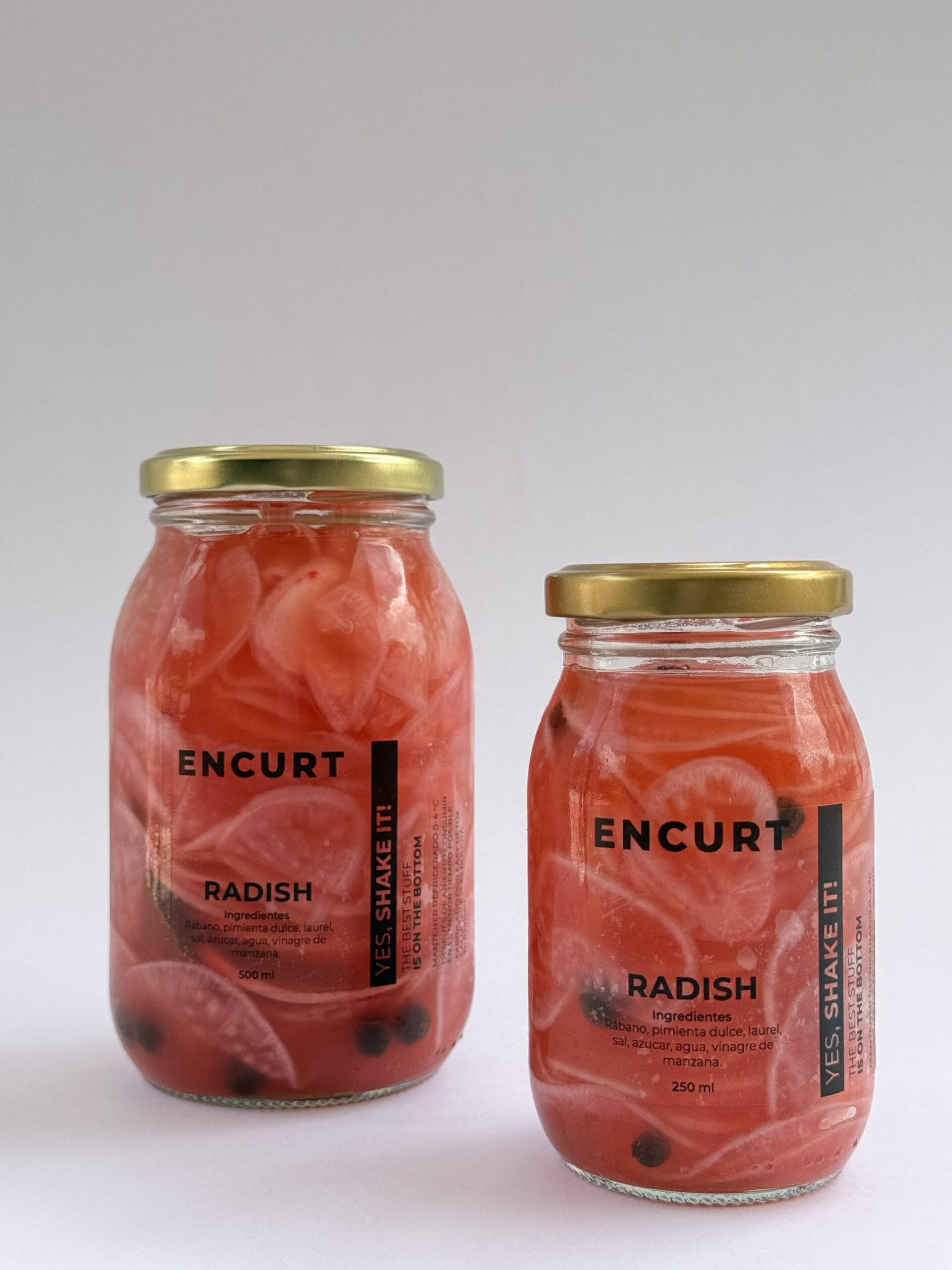 Encurtido de rábano, pimienta dulce, laurel, sal, azúcar, agua y vinagre de manzana.